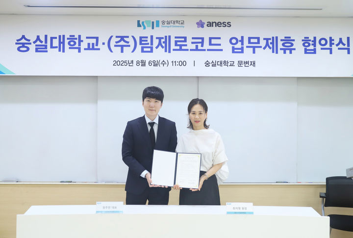 [서울=뉴시스]전수현 인턴 기자 = 숭실대 중소기업대학원은 지난 6일 생성형 인공지능(AI) 플랫폼 기업 ㈜팀제로코드와 교육 및 기술 협력을 위한 업무협약(MOU)을 체결했다고 밝혔다.