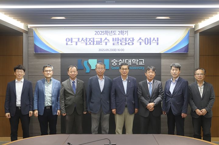 [서울=뉴시스]전수현 인턴 기자 = 숭실대는 지난 23일 서철헌 교수(전자정보공학부 IT융합전공)와 천명기 교수(물리학과)를 첫 연구석좌교수로 임용했다.